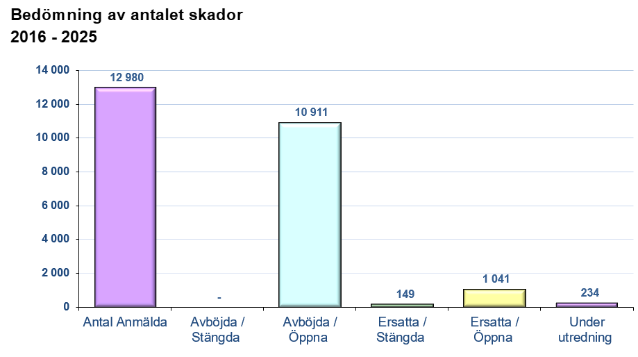 De skador som anmälts utreds av medicinsk och juridisk expertis. Ungefär en fjärdedel av de anmälda skadorna brukar bedömas som ersättningsbara. Under 2025 anmäldes 1 887 skador (2024 1 044 skador).