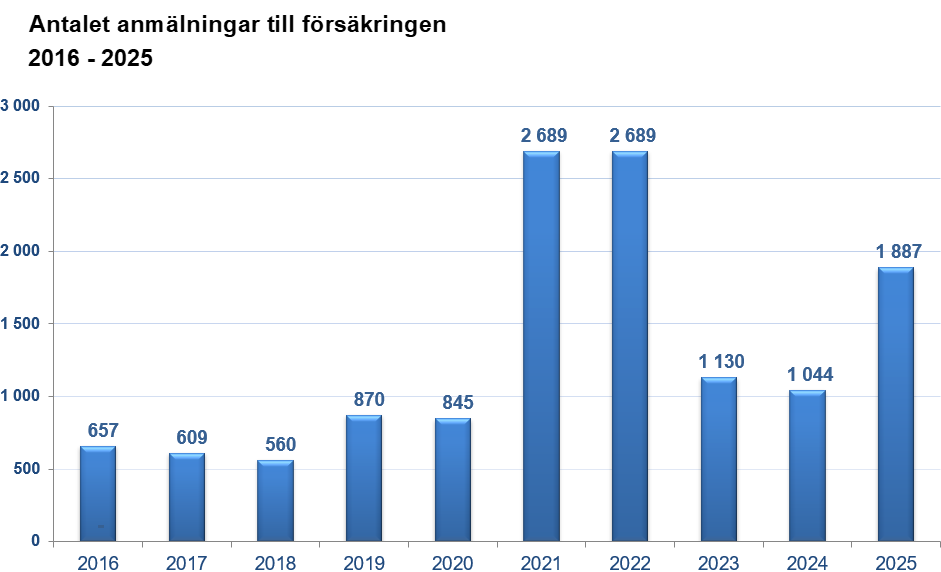 Läkemedelsförsäkringen har funnits sedan 1978. Antalet anmälningar har ökat från några hundra under de första åren till närmare 2.700 st rekordåret 2021. Under de senaste åren har antalet anmälningar legat runt 500 till 1.000 st. Utvecklingen de senaste tio åren visas i diagrammen nedan.